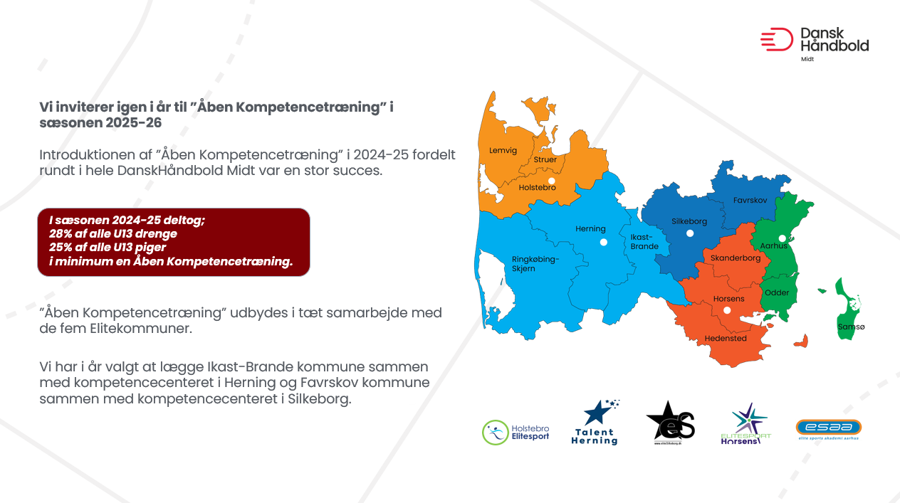 DanskHåndbold Midt udbyder Åben Kompetencetræning i et tæt samarbejde med alle fem Elitekommuner i regionen. Det betyder i praksis at DanskHåndbold Midt er inddelt i fem Kompetencecentre med afsæt i en Elitekommune, som vil dække hele DanskHåndbold Midt, inklusiv alle kommuner og foreninger.