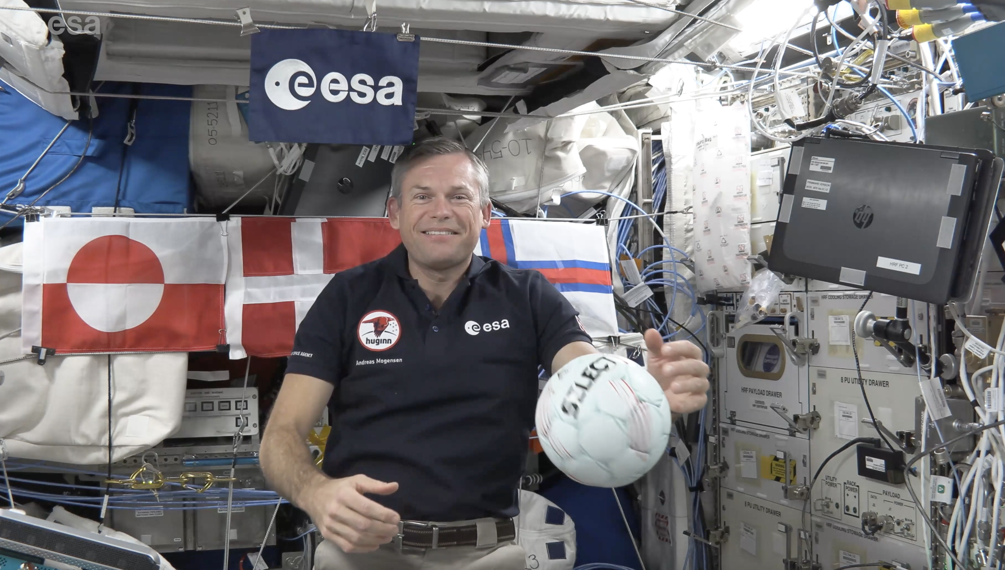 Optagelsen er et lille stykke håndboldhistorie, for det er første gang, en håndbold kan ses svæve i vægtløs tilstand i det ydre rum, mens Andreas Mogensen ønsker Håndboldkvinderne pøj pøj.