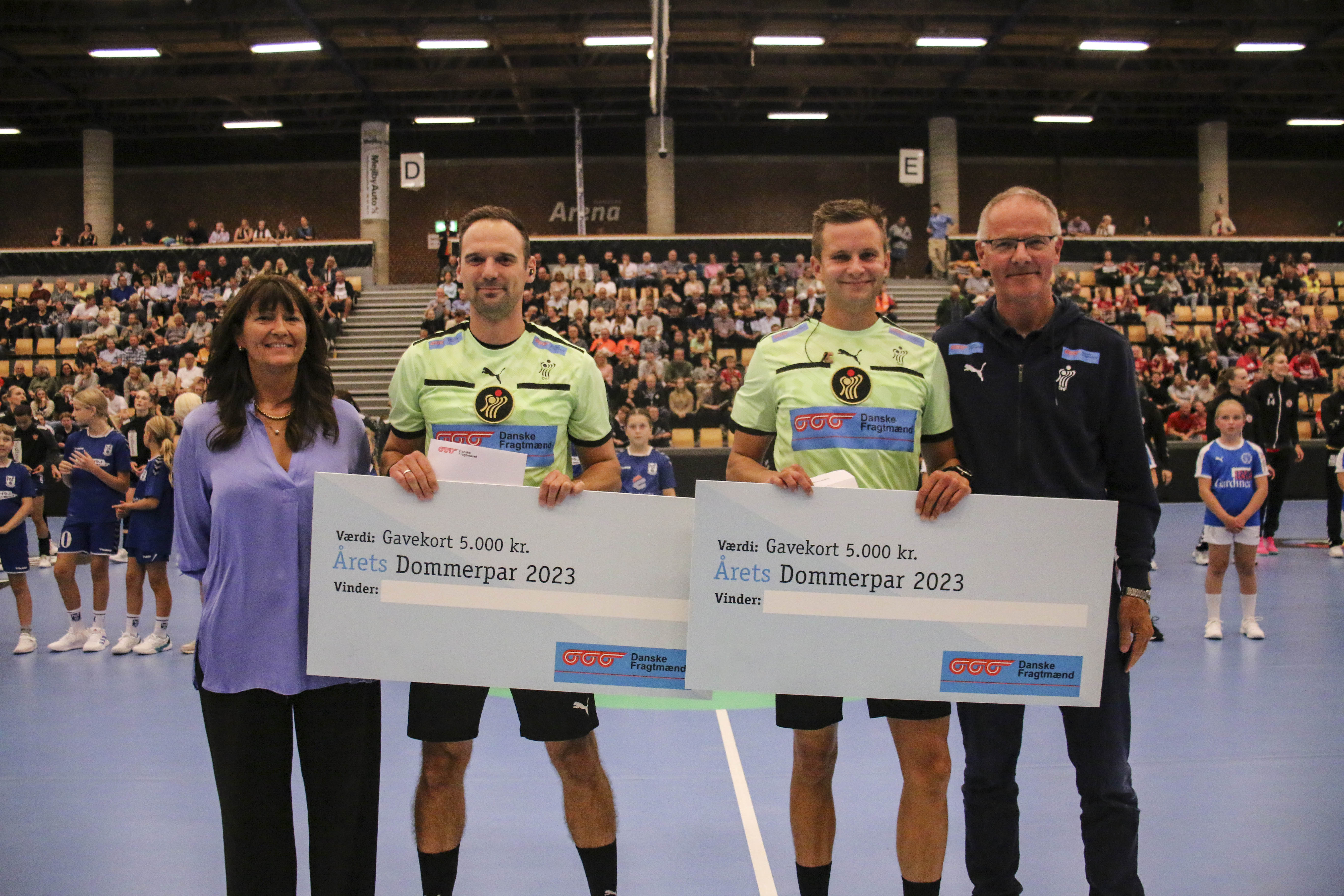 - Årets dommerpar er gode kollegaer og er altid villige til at give dommergerningen en ekstra skalle. De har haft en fantastisk 22-23-sæson, hvor de blandt andet dømte kvindernes pokalfinale og også her leverede på højt niveau, lød det, da halspeakeren i Randers annoncerede de glade prismodtagere.
