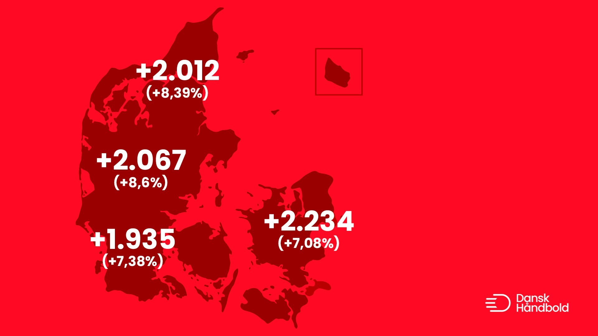 Geografisk fordeler medlemstilgangen sig også nogenlunde ens, da medlemstallet i DanskHåndbolds fire regioner stiger mellem 7 % og 8,3 %.