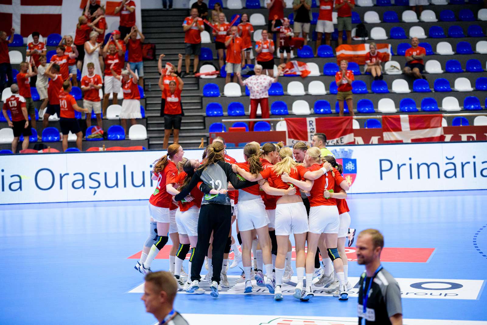 Danmark fejrer den vigtige sejr over Frankrig i den første mellemrundekamp. Foto: Mihai Nițoiu