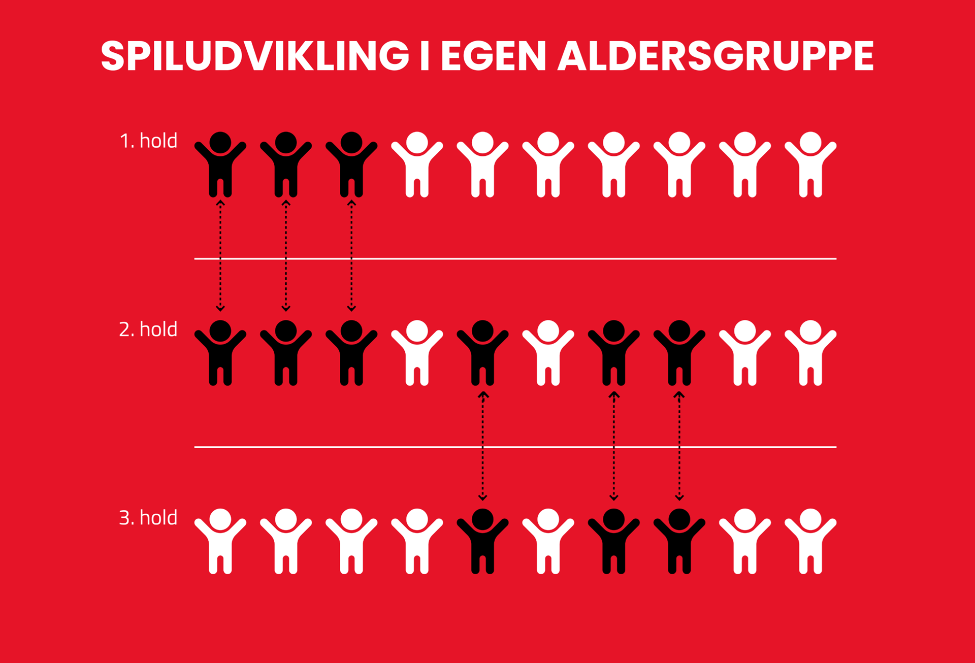 Det betyder, at hvis du i din forening har fx tre U13-pigehold – et A-, B- og C-række-hold, så må man ikke bruge en spiller fra A-holdet på C-holdet og omvendt - altså må der kun rykkes et hold/en række af gangen.