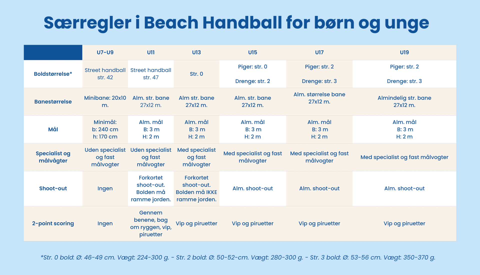 Herunder finder du et fint grafisk overblik over, hvilke regler, der gælder for de forskellige aldersgrupper i Beach Handball.