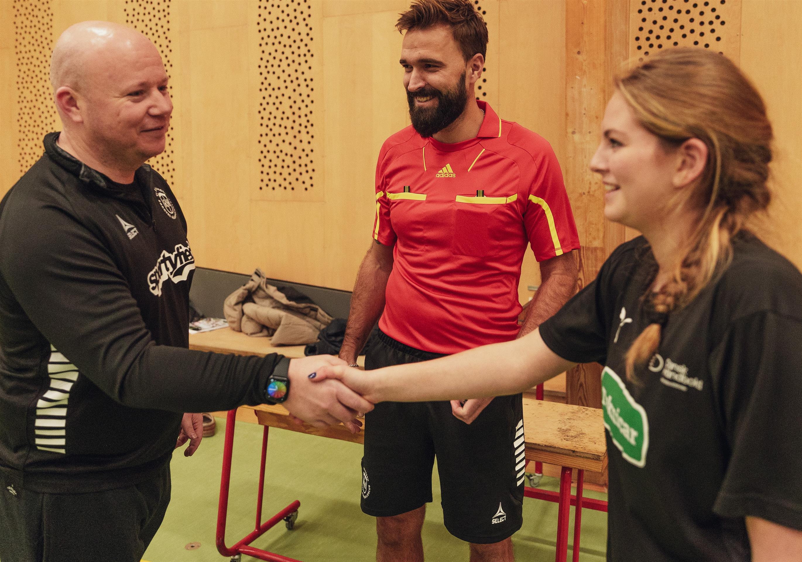 Trænerne og dommere – Ros og anerkende hinanden for noget af det, som var med til, kampen blev en god oplevelse for alle.