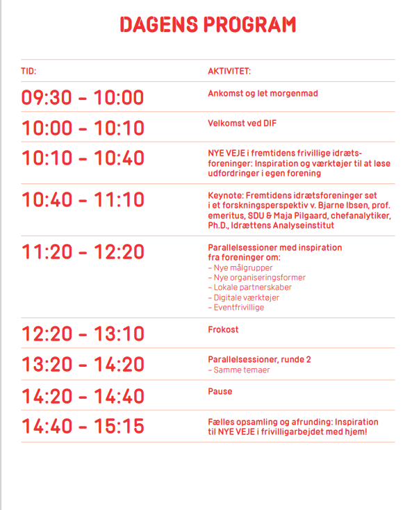 Konferencen trækker både på ekspertviden og gode eksempler fra idrætsforeninger, men det vigtigste er, at der er god tid og plads til, at I kan arbejde med dine perspektiver fra hverdagen i din forening.