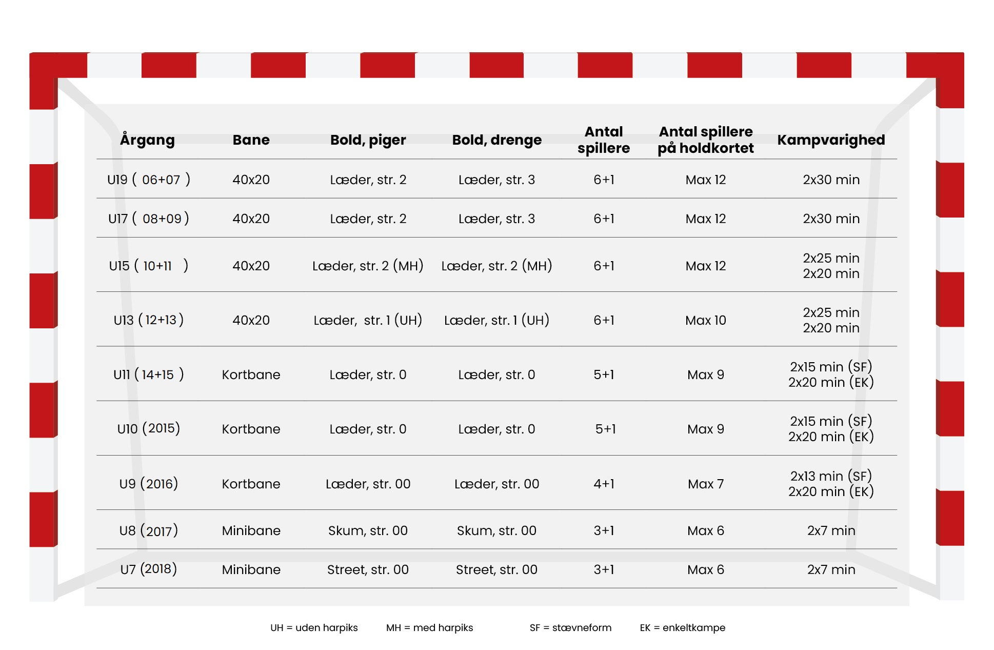 I Danmark spiller vi håndbold på tre forskellige banestørrelser: minibane, kortbane og 40x20. På denne side får du et overblik over de forskellige banestørrelser samt hvilke spilformer og årgange, der benytter hvilken bane.