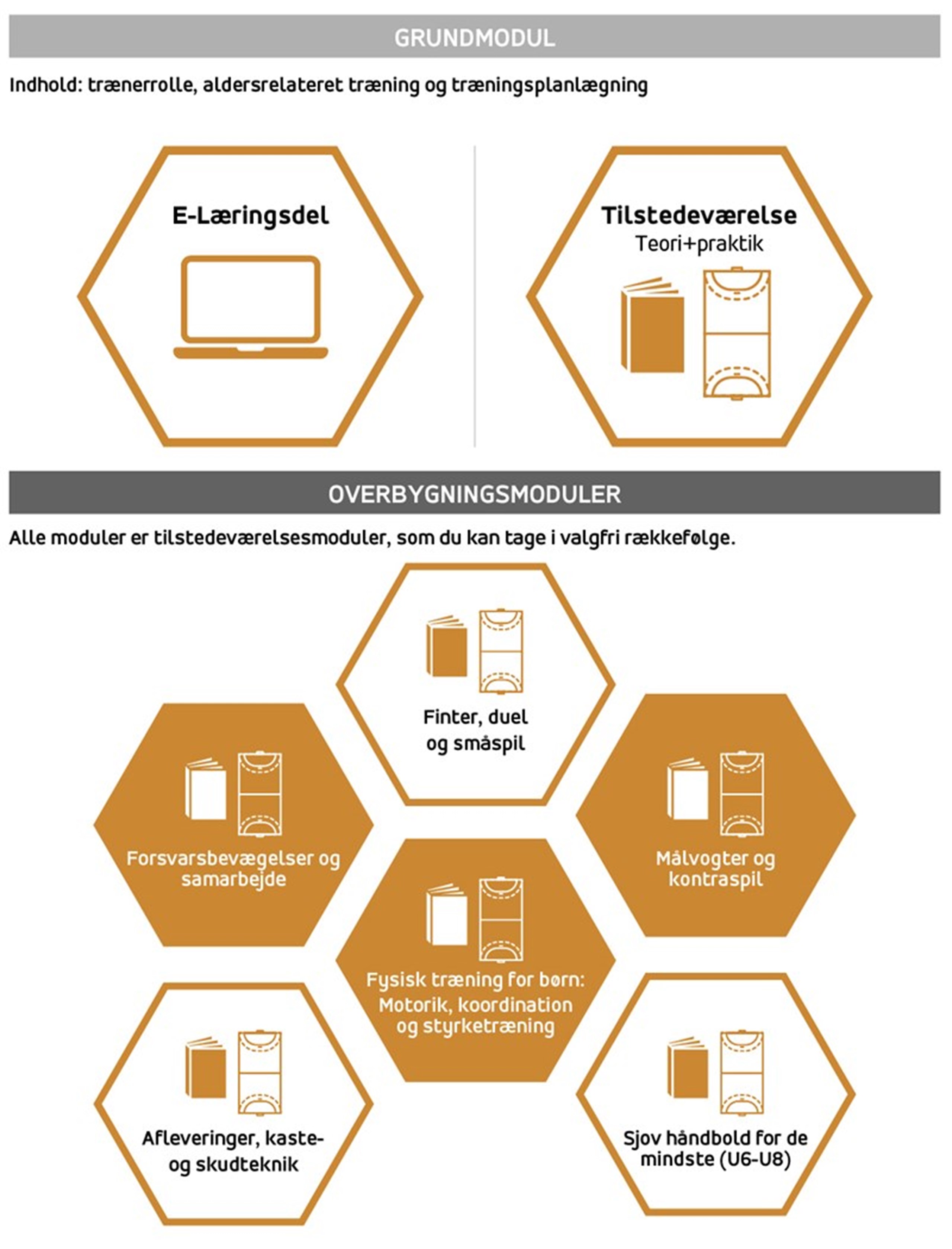 Overbygningen består af seks forskellige moduler. Modulerne er praktiske moduler med forskellige temaer fra håndboldspillet. Det er valgfrit, i hvilken rækkefølge du tager modulerne.