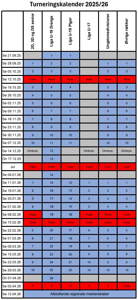 På denne side finder du information om turneringer, stævner og andre aktiviteter. Samt hvem du skal ringe til, hvis en kamp skal rykkes, I har brug for hjælp i foreningen eller ønsker at vide mere om de mange uddannelsesmuligheder.
